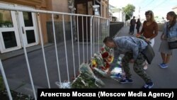 Цветы и свечи к дипломатическому представительству США несут в память о погибших во время стрельбы в Орландо.